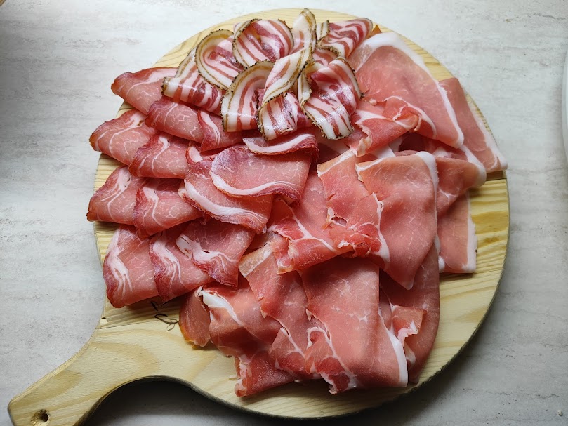 taglieri di salumi misti, tutti di produzione propria (capocollo, salsicce, altri salumi di suino e cinghiale);