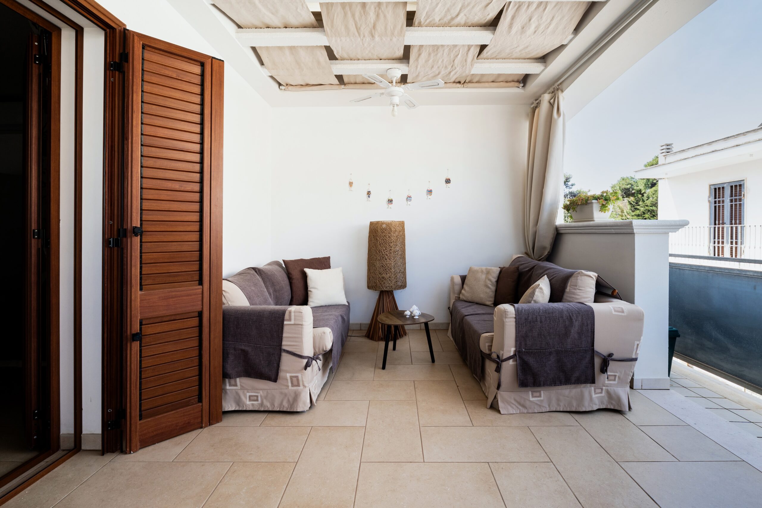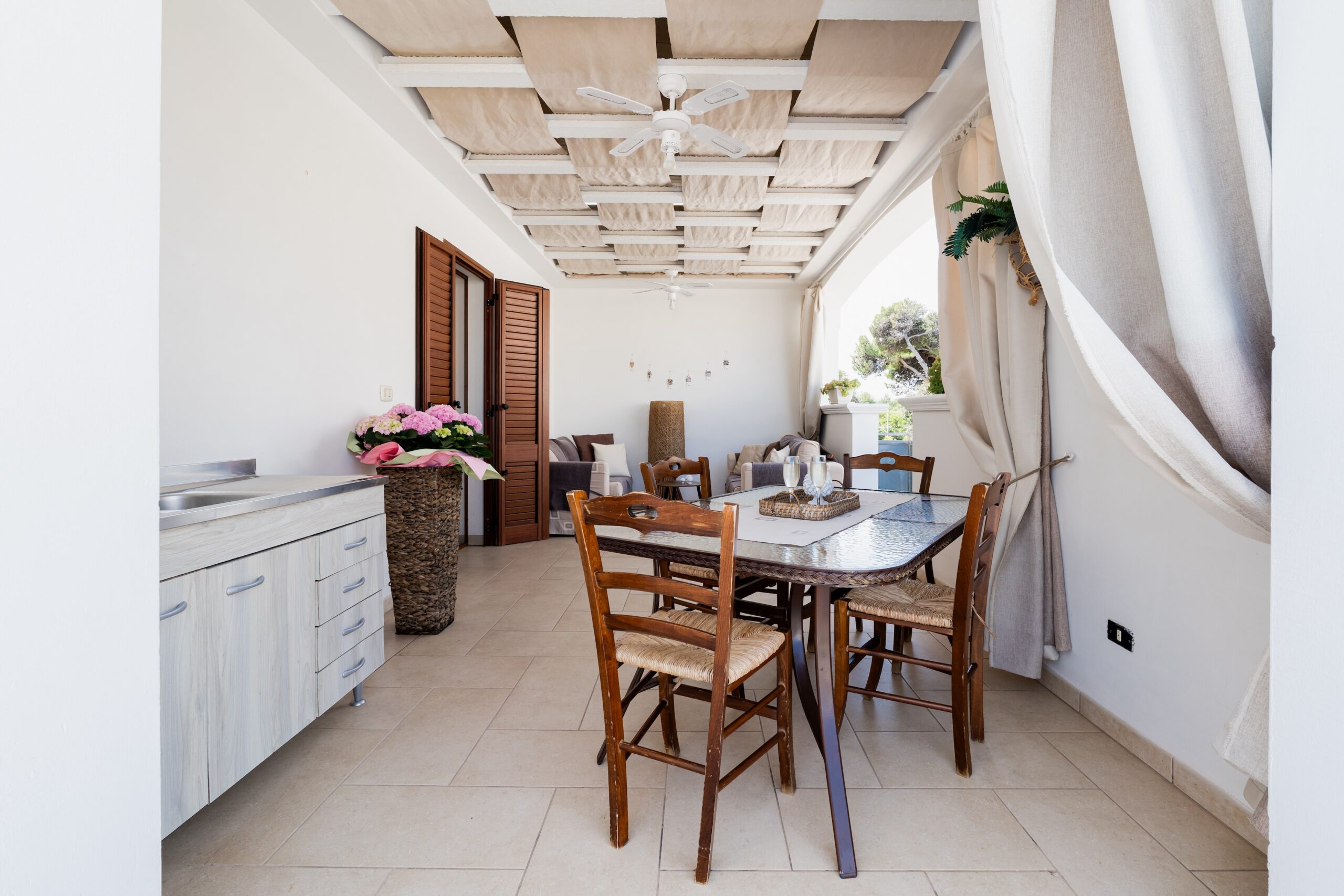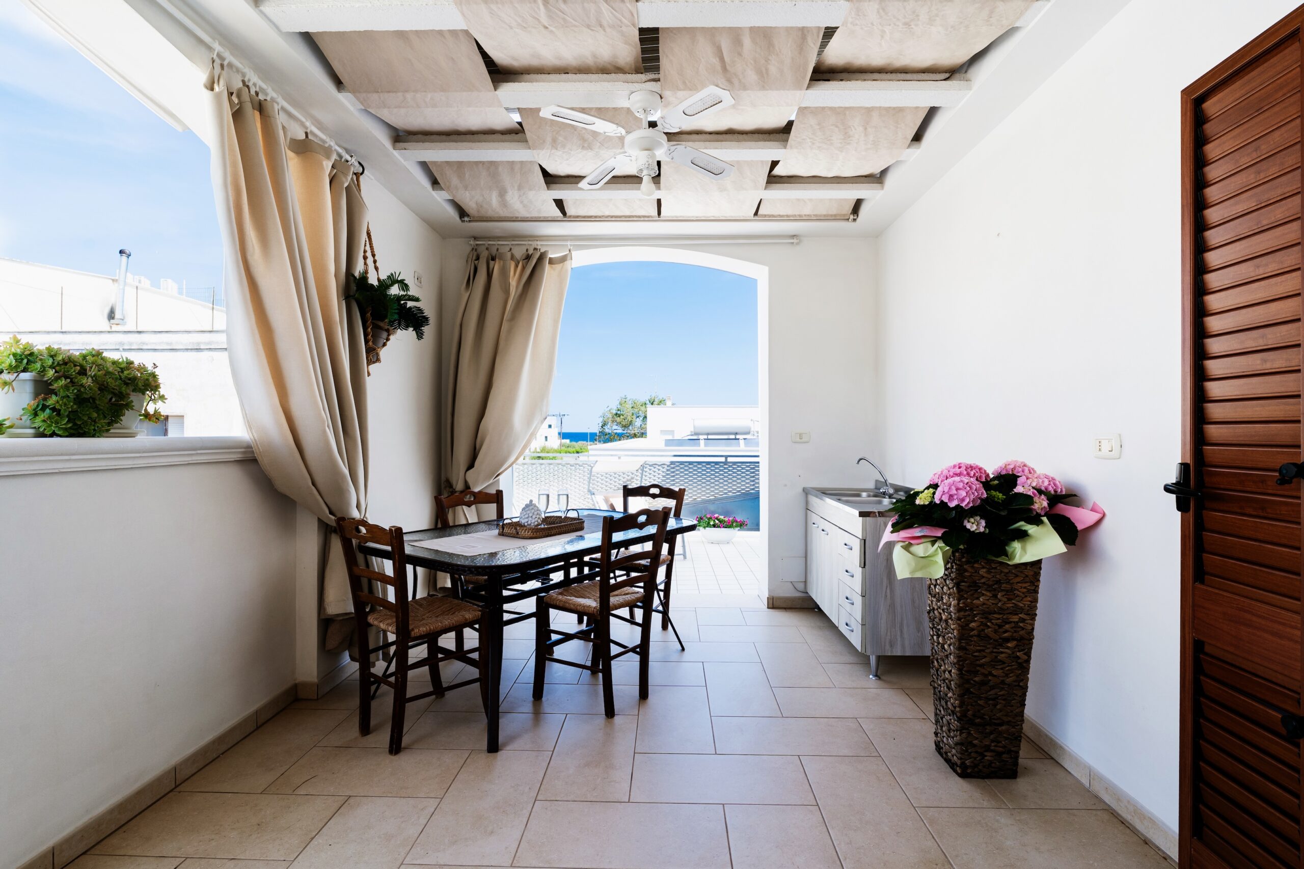 Per mangiare all’aperto una veranda vista mare arredata con ogni comfort.
