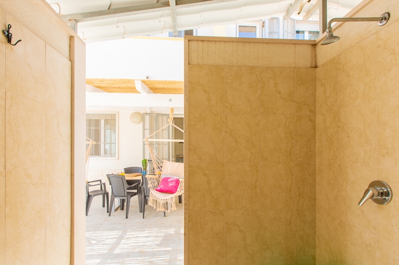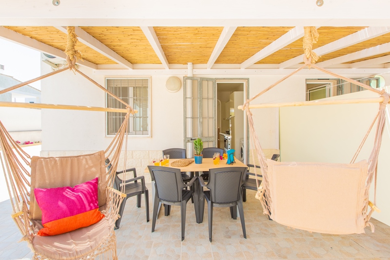 Due verande con mobili da giardino e due lettini spiaggia, doccia dopo spiaggia ed un lavapanni.