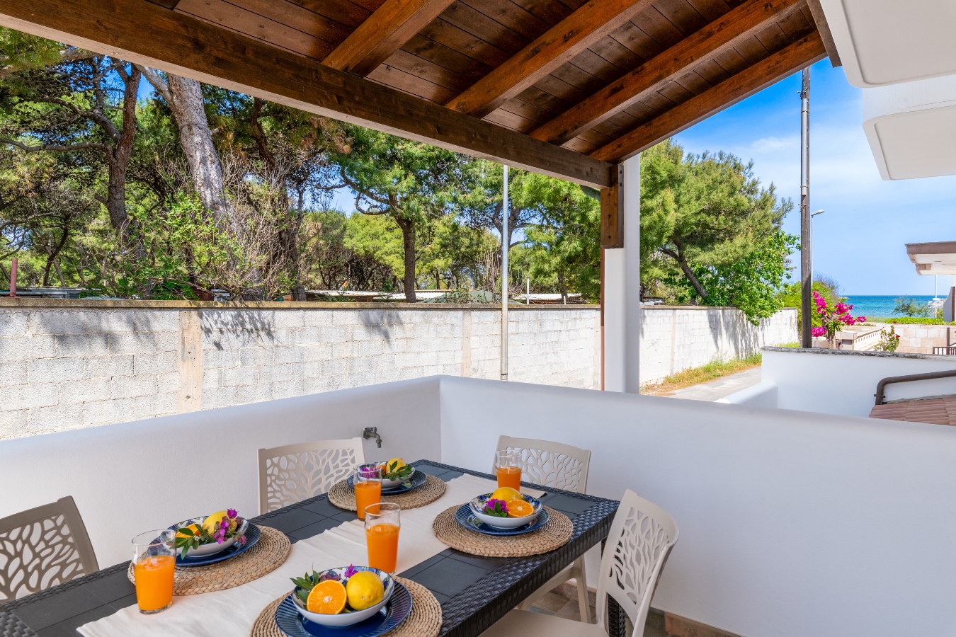 Veranda con tavolo per pranzi all’aperto.