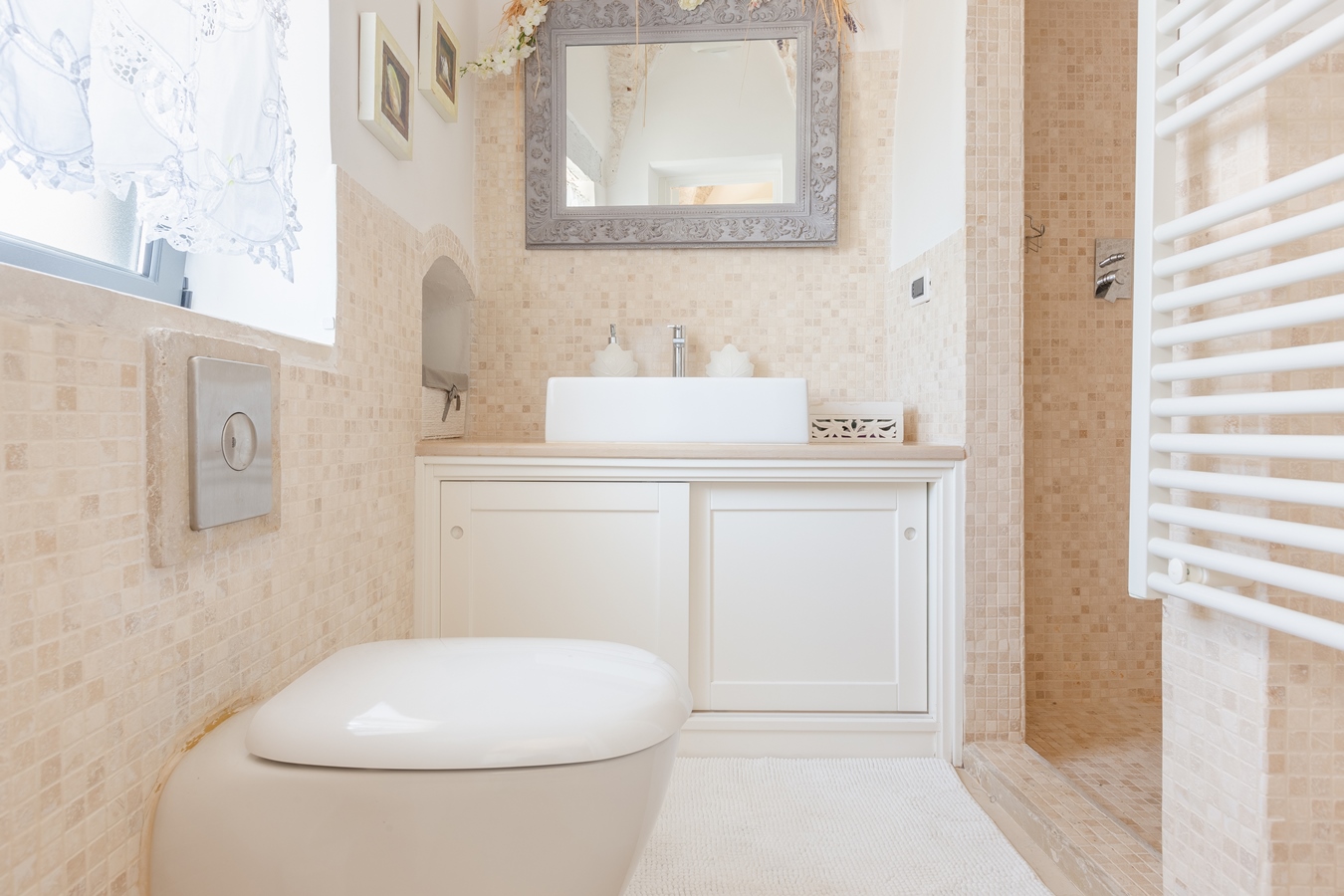in questa casa hai due bagni, uno in camera da letto ed uno in soggiorno;