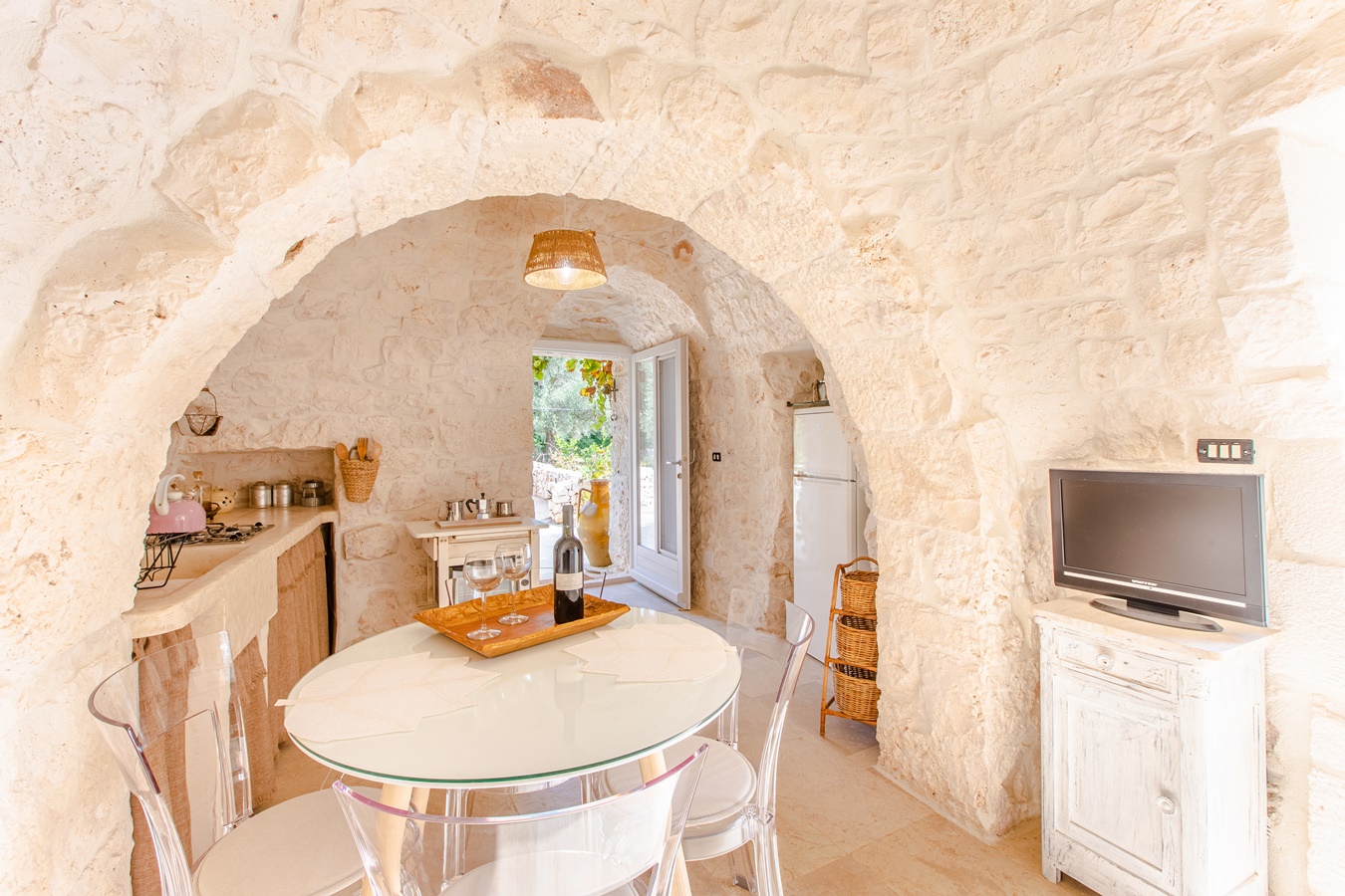 n.1 camera da letto matrimoniale, n.1 poltrona letto 75×190 cm in soggiorno, n.1 disimpegno con aria condizionata che rinfresca l’intero trullo, n. 1 soggiorno con angolo cottura a tre fornelli, 1 bagno con doccia.