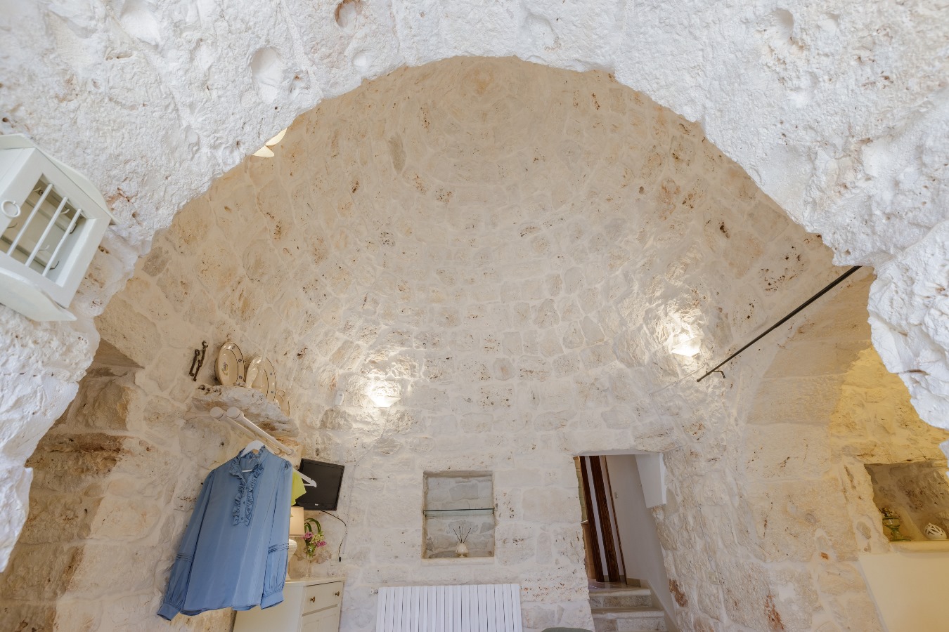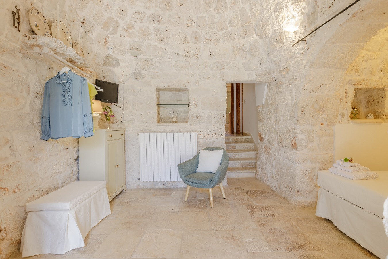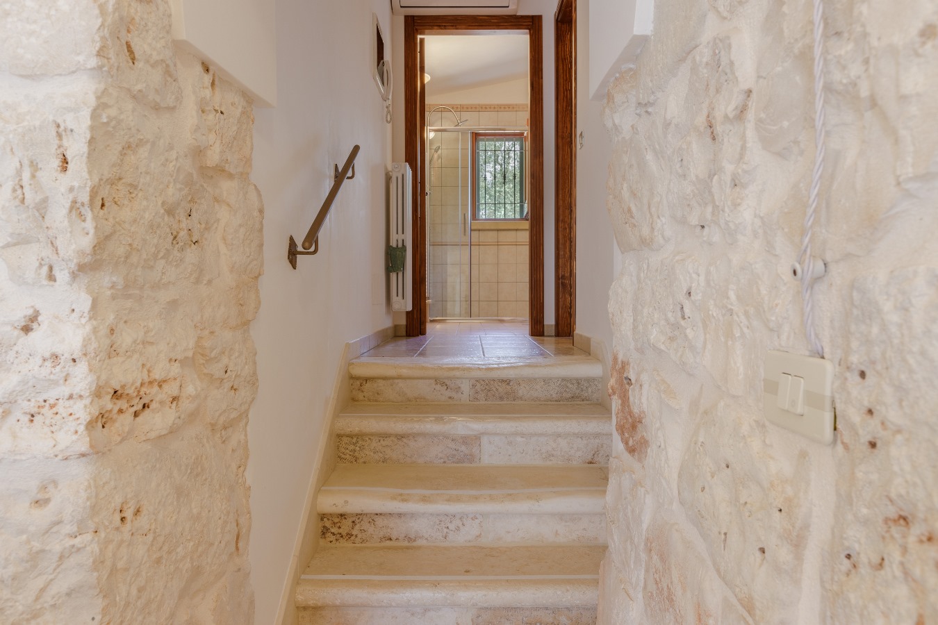 Al piano rialzato, n.1 camera matrimoniale con n.1 armadio spazioso, n.1 bagno con box doccia, n.1 climatizzatore nel disimpegno che rinfresca l’intero trullo.