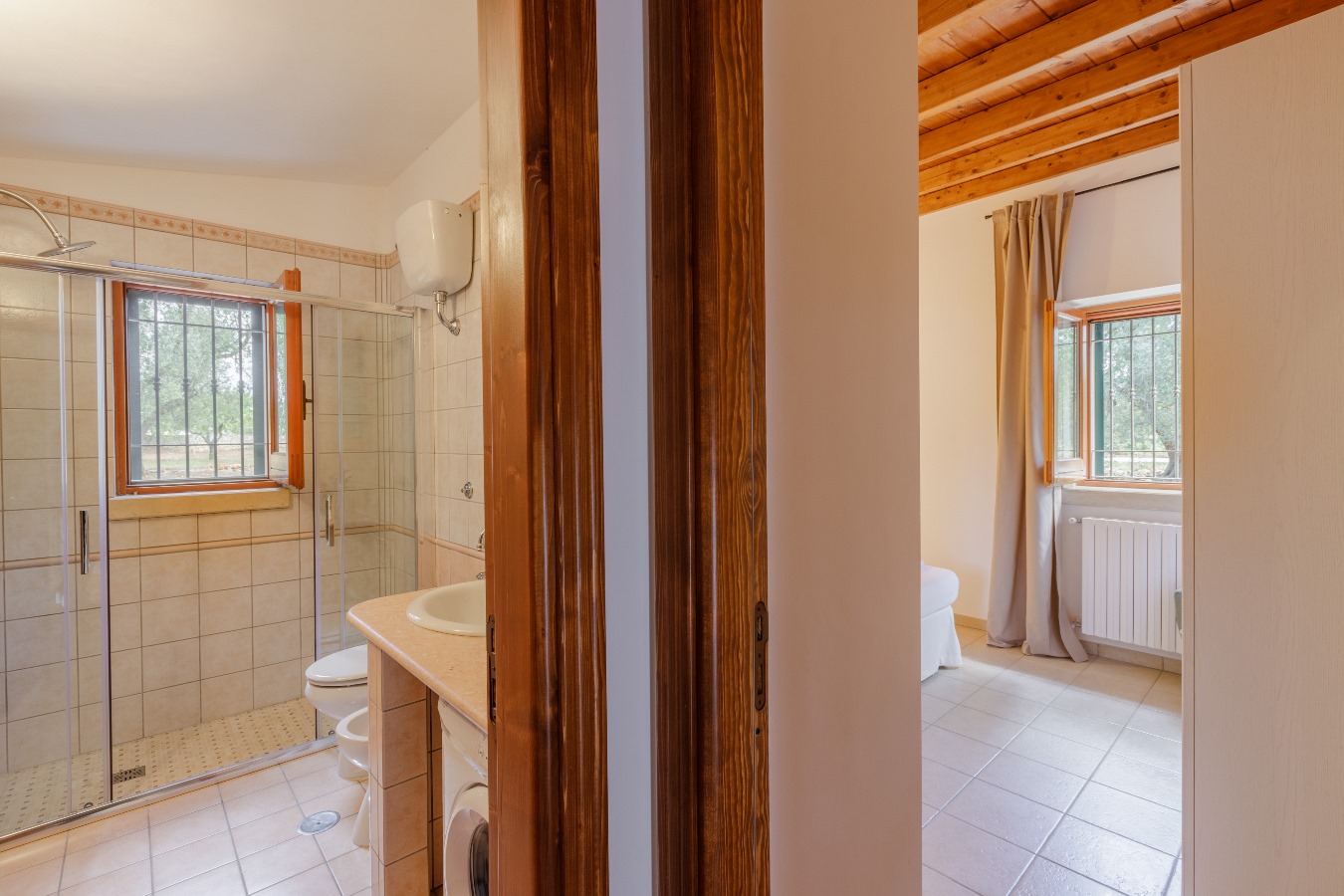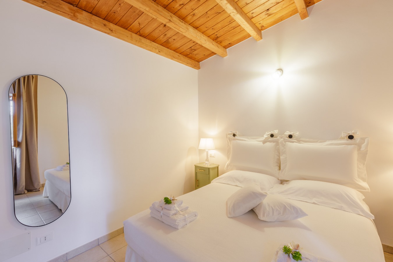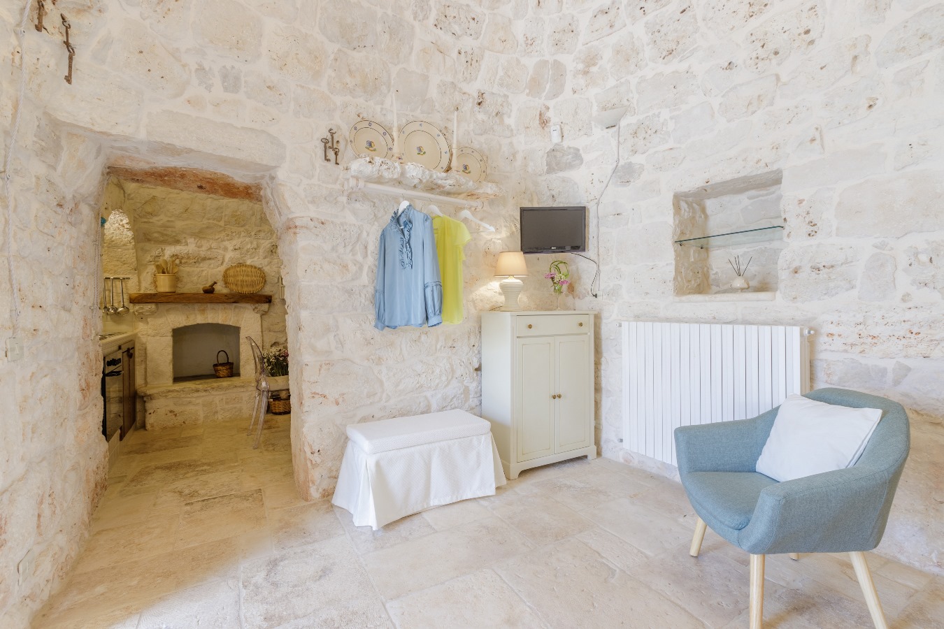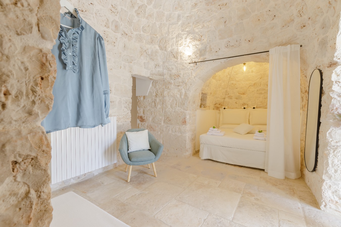 Al piano rialzato, n.1 camera matrimoniale con n.1 armadio spazioso, n.1 bagno con box doccia, n.1 climatizzatore nel disimpegno che rinfresca l’intero trullo.