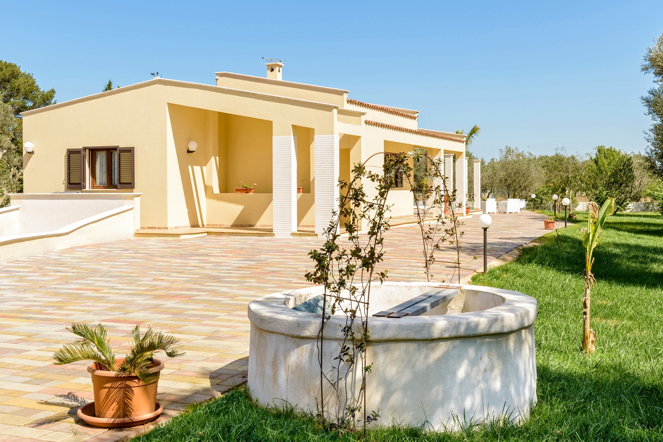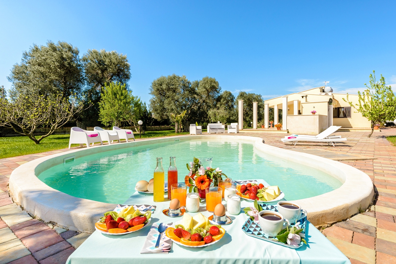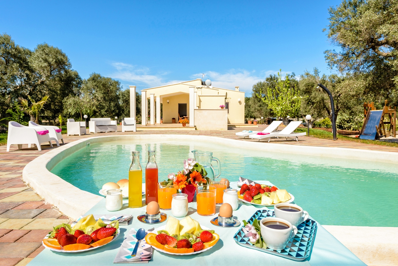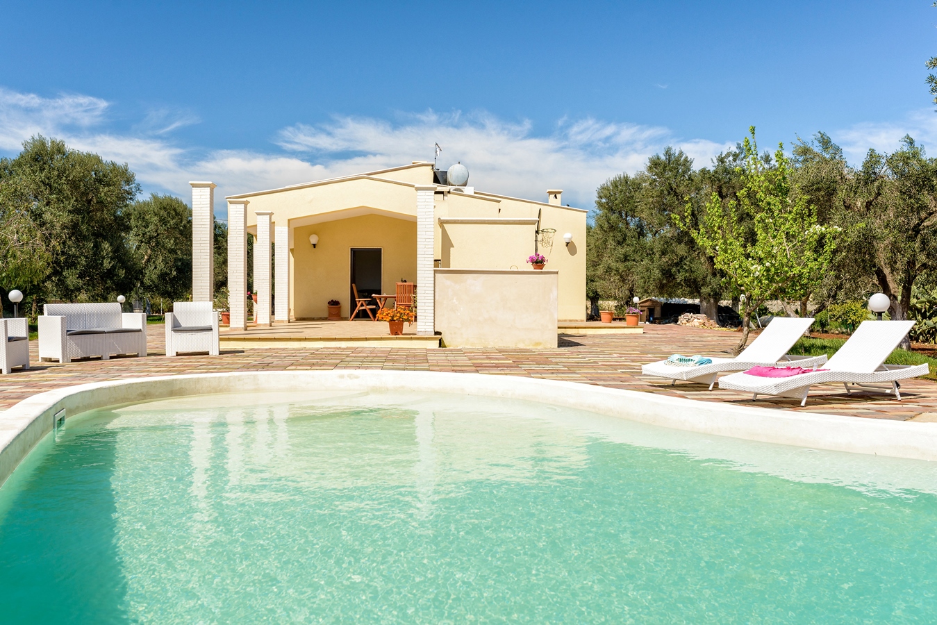 Villa Käthe si trova a San Vito dei Normanni nell’area dell’ Alto Salento’. E’ una villa a schiera che ospita fino a 6 persone, a circa 10 minuti d’auto dalla Riserva di Torre Guaceto, una spiaggia dal fascino caraibico. La casa offre una piscina indipendente e un giardino privato. Le famiglie con bambini apprezzeranno il giardino con prato inglese e il parco giochi. Oltre ad offrire il relax e la privacy della campagna campagna, dà la possibilità di essere vicino a negozi, bar e trattorie e ad alcuni dei borghi più pittoreschi della Puglia, come Ostuni la rinomata ‘Città Bianca’.