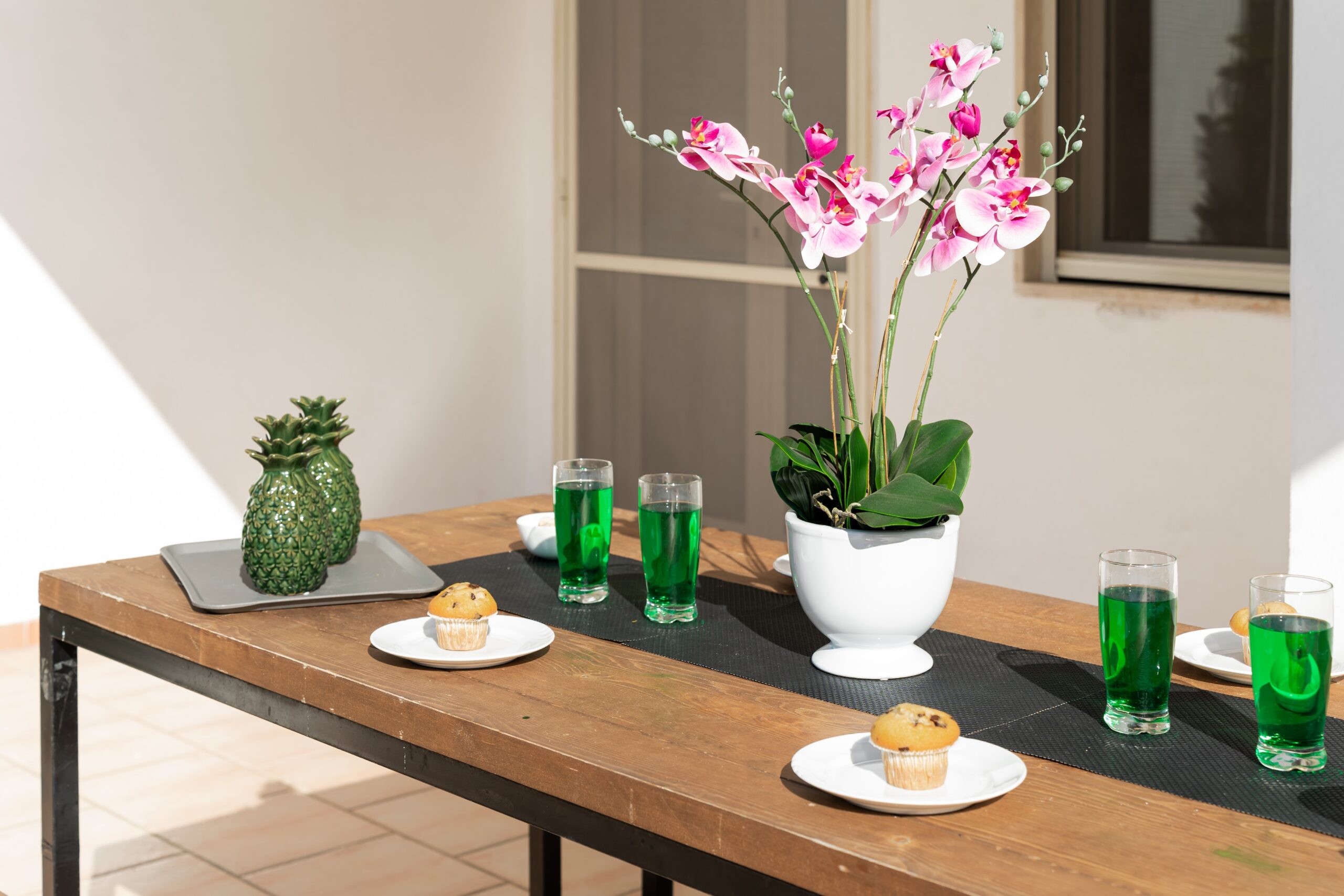 Tavolo da pranzo con affaccio sul giardino per mangiare all’aperto.