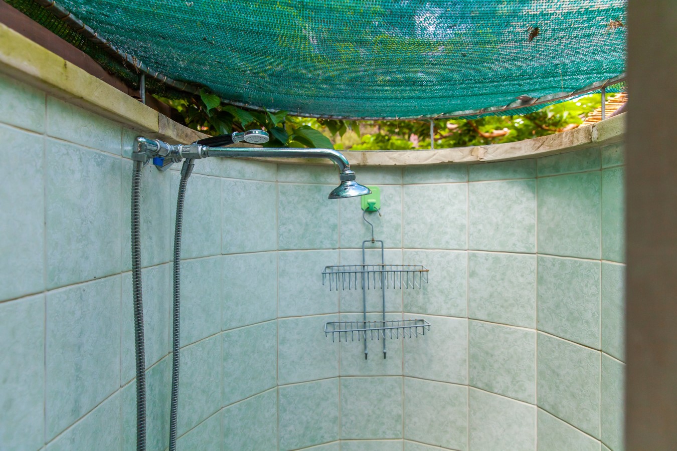hai tanti spazi all’aperto, un dondolo, una veranda con ventola a soffitto e tv e una doccia dopo spiaggia;